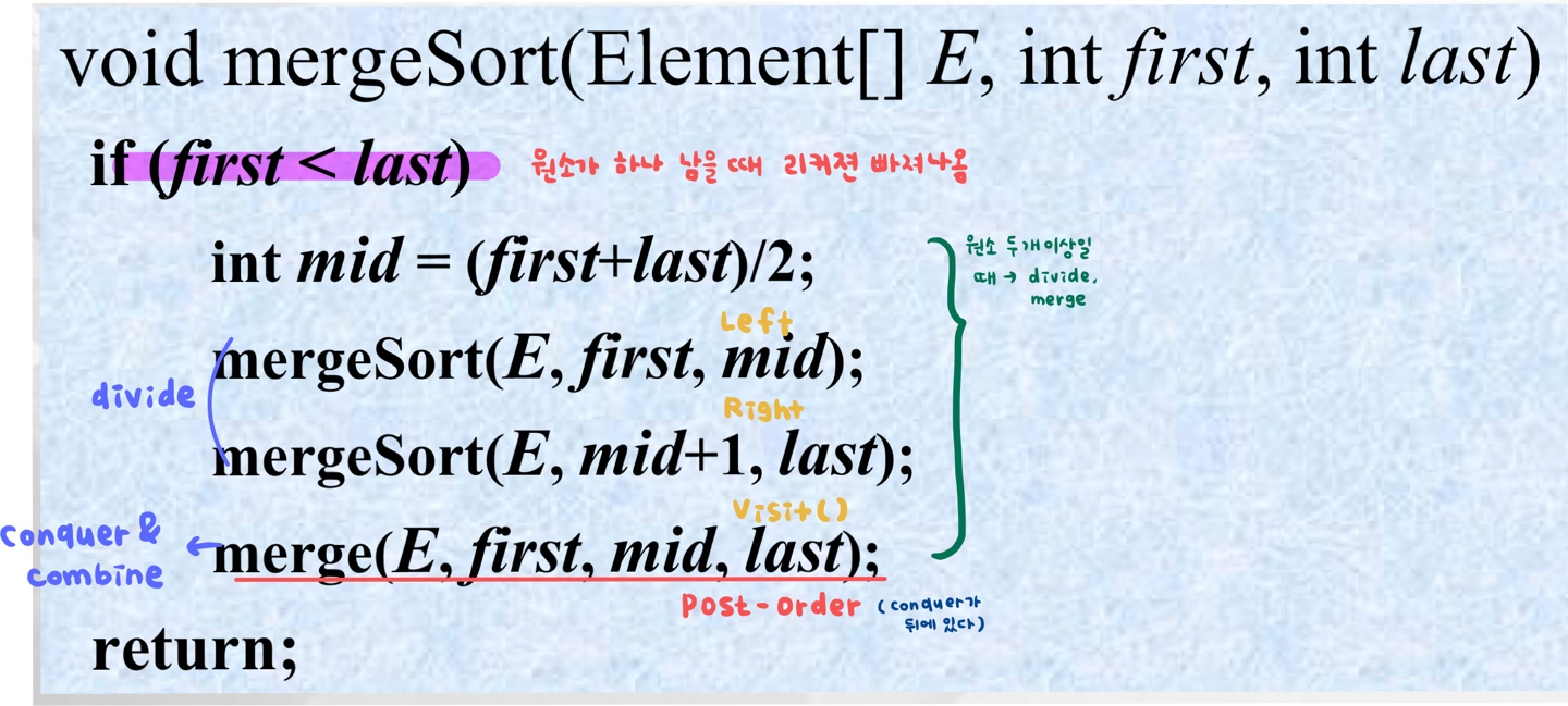 - 하나의 리스트를 두 개의 균등한 크기로 분할하고 분할된 부분 리스트를 정렬한 다음, 두 개의 정렬된 부분 리스트를 합하여 전체가 정렬된 리스트를 얻고자 하는 것