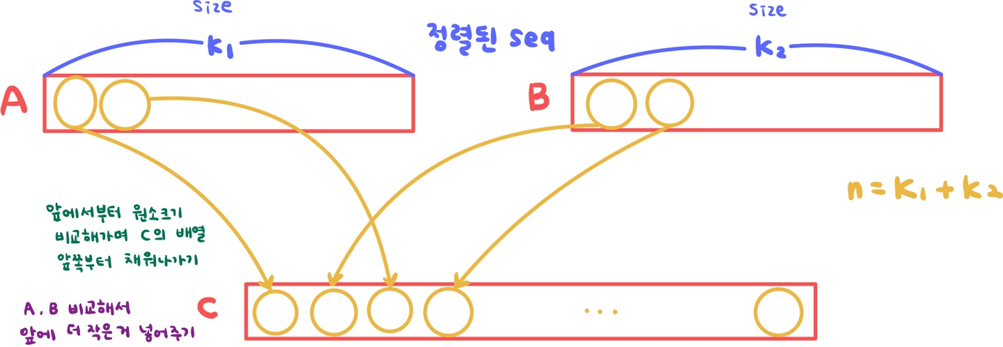 - A와 B 두 개의 리스트의 요소들을 처음부터 하나씩 비교하여 두 개의 리스트의 요소 중 더 작은 요소를 C로 옮긴다.
