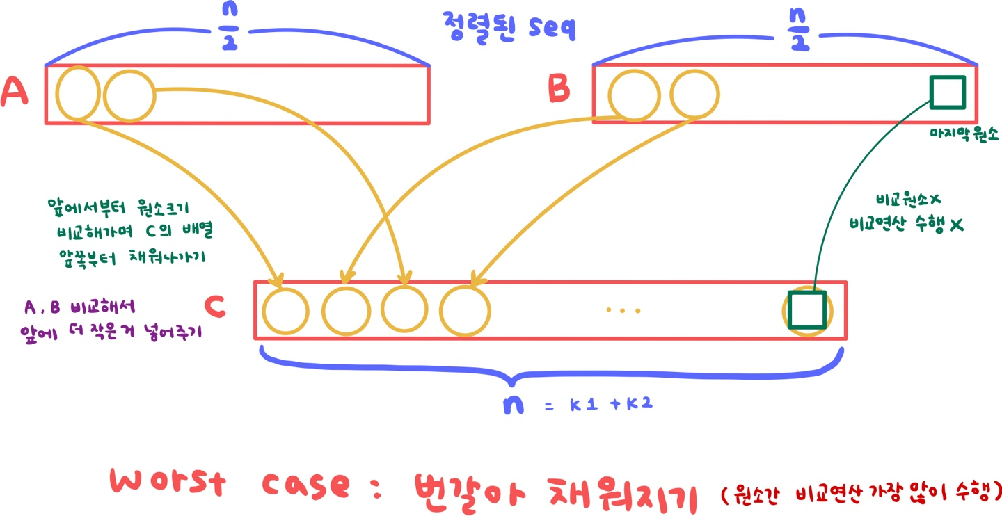 ↳ - 1은 마지막 원소. 마지막 원소는 비교할 원소가 없기 때문에 별도의 연산 없이 바로 C에 복사한다. 따라서 마지막 원소에서는 비교연산이 일어나지 않는다.