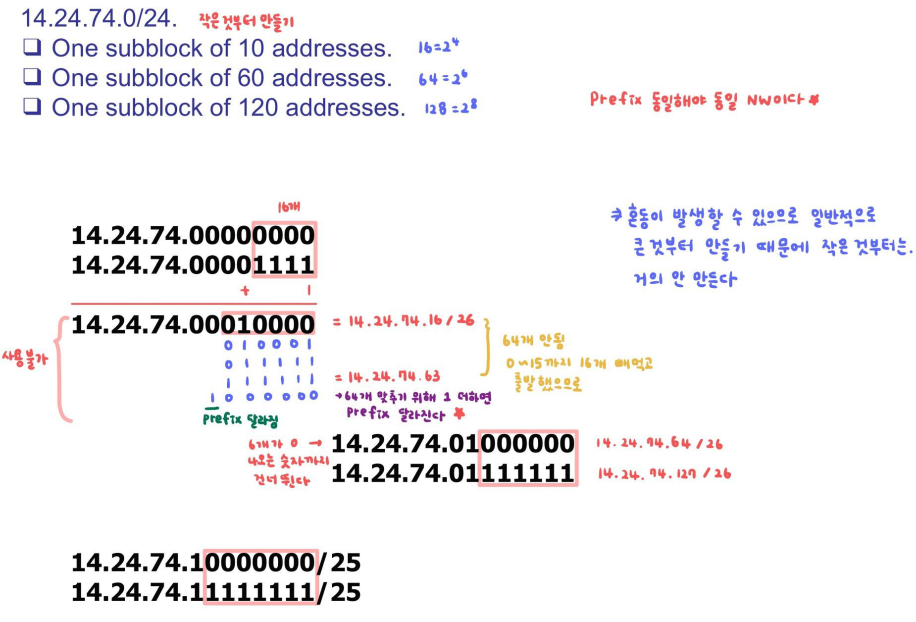b. 두 번째 subblock의 주소 갯수: 60 ☞ 2의 거듭제곱이 아니다. 60보다 큰 2의 지수값 중 가장 작은 값을 주소로 할당한다. (64 = 2^6)
