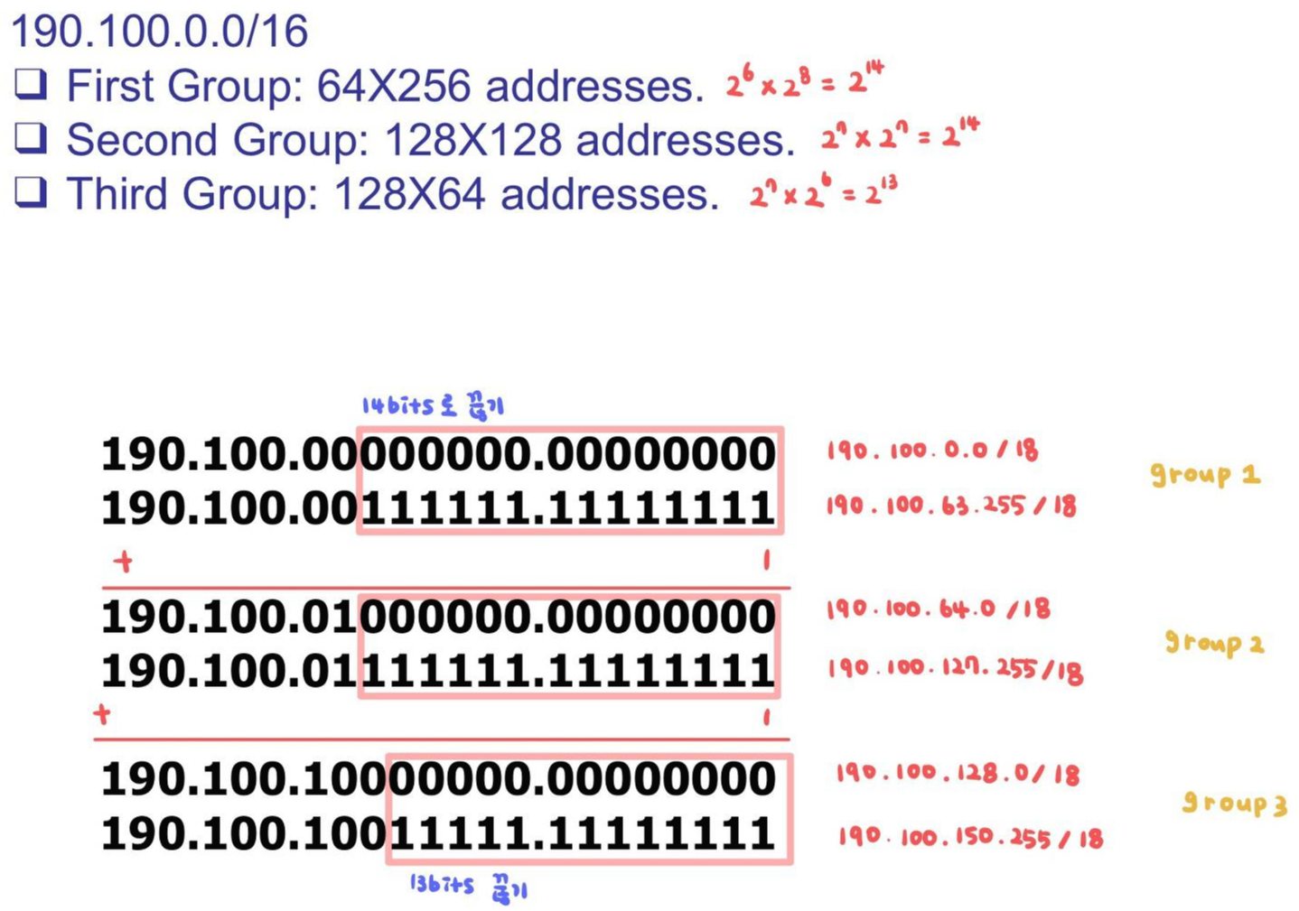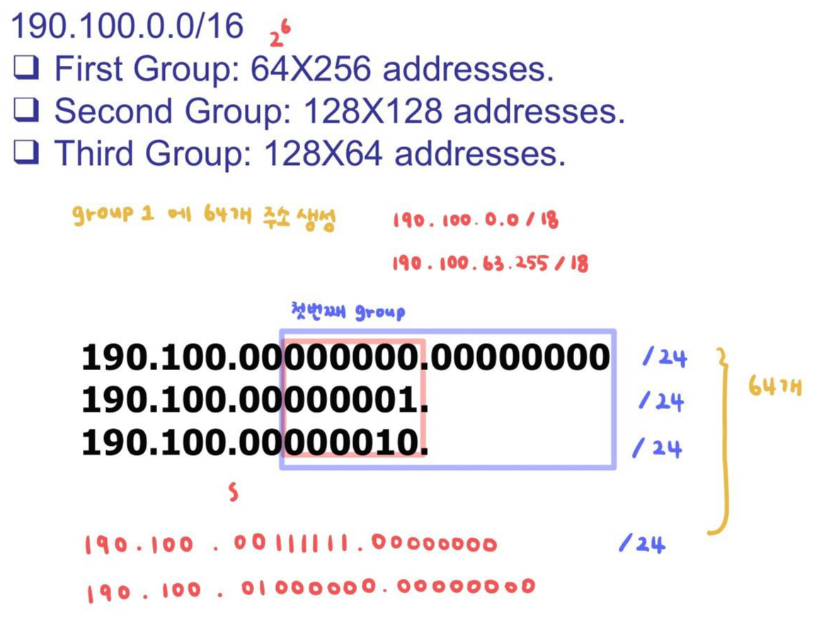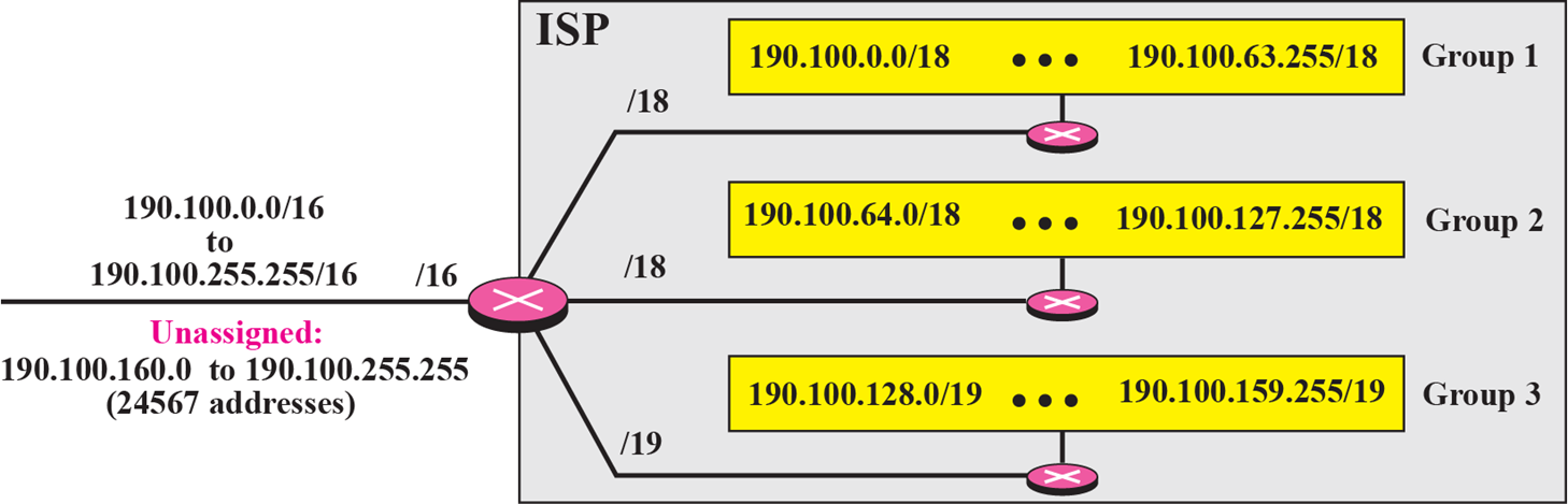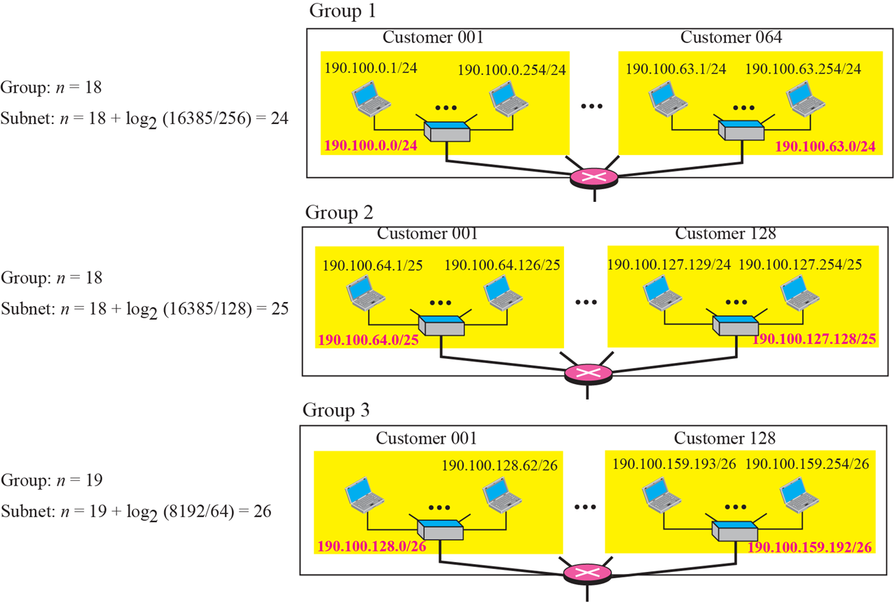 ISP에는 190.100.0.0/16(65,536개 주소)으로 시작하는 주소 블록이 부여된다. ISP는 다음과 같이 세 그룹의 고객에게 해당 주소를 배포해야 한다.
