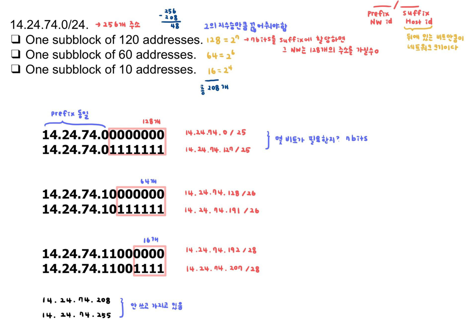 d. 이전 subblock의 모든 주소를 추가할 경우 결과는 208개이며, 이는 48개 주소가 사용되지 않고 있음을 의미한다. 이 범위의 첫 번째 주소는 14.24.74.208이고 마지막 주소는 14.24.74.255이다.