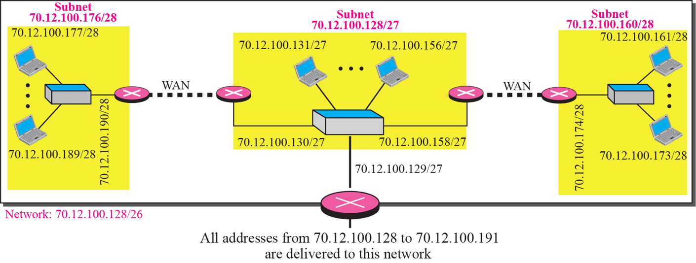 Central office는 70.12.100.128/27 ~ 70.12.100.159/27 주소를 사용한다. 회사는 연결된 세 개의 라우터에 이 주소들 중 3개를 사용하고 서브블록의 마지막 주소를 예약해 둔다.