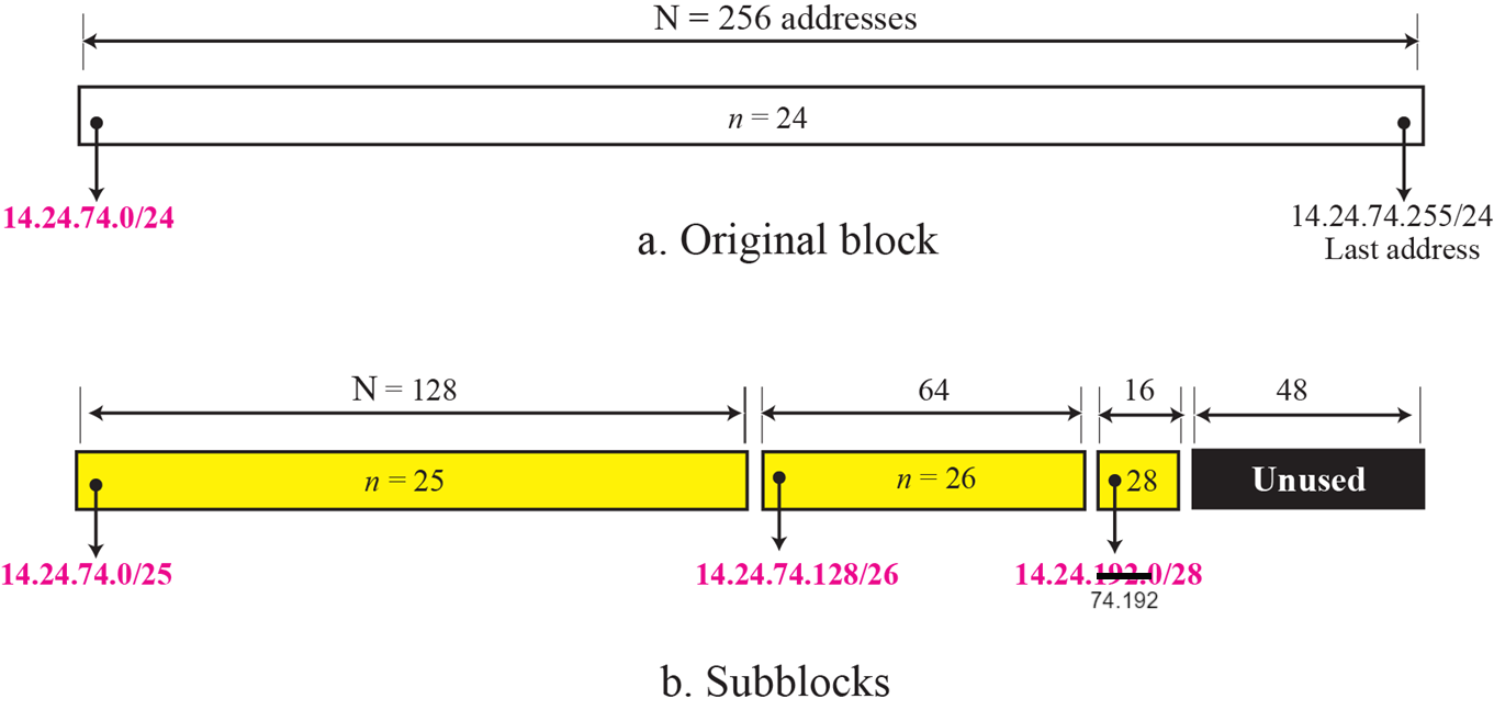조직에 시작 주소가 14.24.74.0/24인 주소 블록이 부여된다. 조직은 아래와 같이 3개의 subnet에서 사용할 3개의 주소 subblock을 필요로 한다.