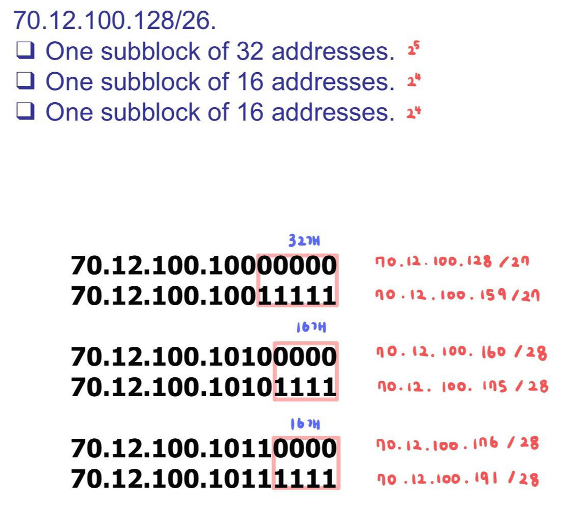 a. 첫 번째 subblock의 주소 갯수: 120 ☞ 2의 거듭제곱이 아니다. 120보다 큰 2의 지수값 중 가장 작은 값을 주소로 할당한다. (128 = 2^7) ☞ 7비트를 suffix에 할당하면 그 네트워크는 128개의 네트워크를 가질 수 있다.