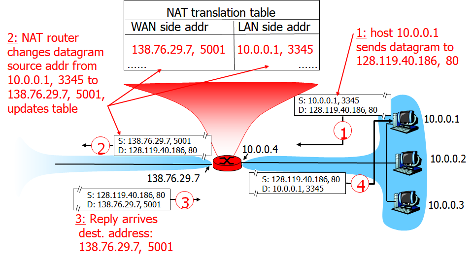 5. 서버에게서 응답이 오면 table을 확인해 서버가 보낸 패킷의 목적지 Port(138.76.29.7, 5001)와 매칭되어 있는 사설망 Port(5001)를 찾은 뒤(어떤 호스트를 위해 5001번을 만들었는지 찾아봄) 해당 주소(10.0.0.1, 3345)로 정보를 전달한다.