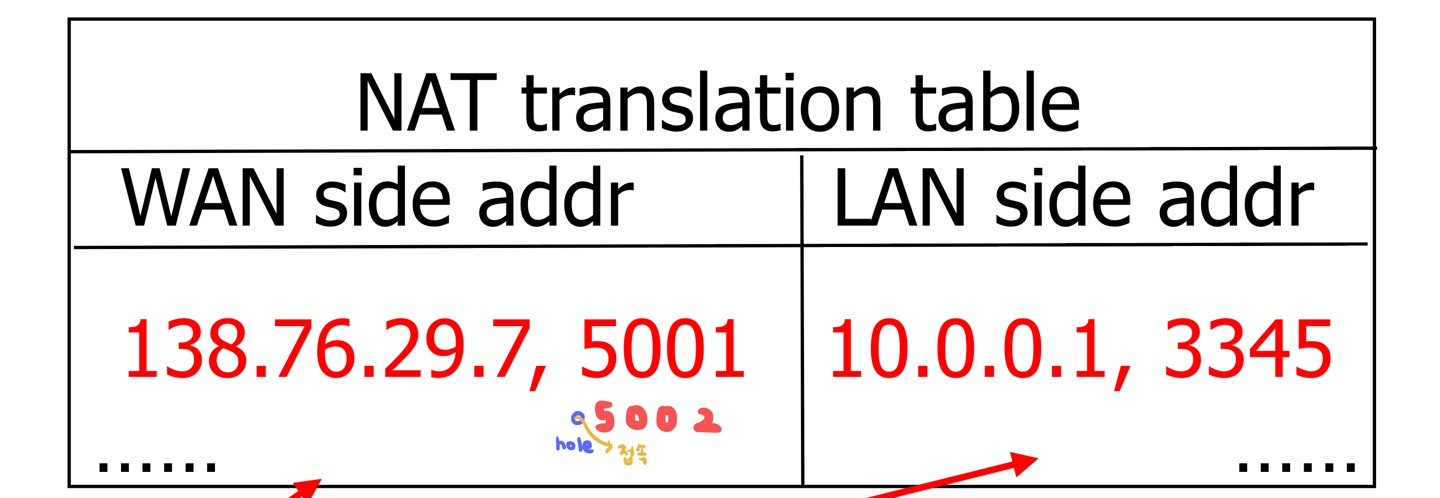 * NAT가 할당해주는 외부에서 사용가능한 IP주소는 NAT 라우터 자기자신의 IP주소이다.