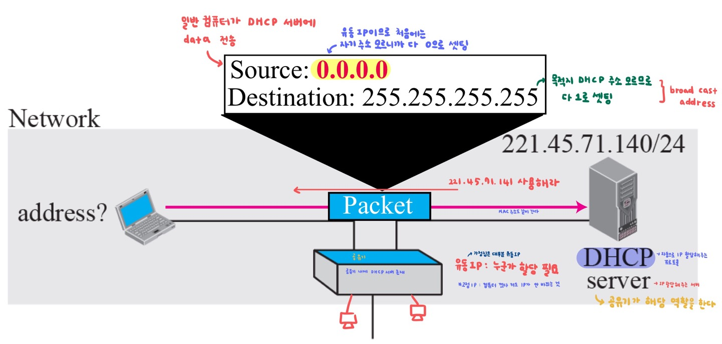 - 클라이언트는 네트워크 부팅과정에서 DHCP 서버에 IP주소를 요청하고 DHCP는 클라이언트에게 동적으로 IP를 할당해 준다. 인터넷 공유기에 탑재된 DHCP 서버는 각각의 Client PC에 사설 IP를 할당하여 네트워크 연결이 가능하게 한다.