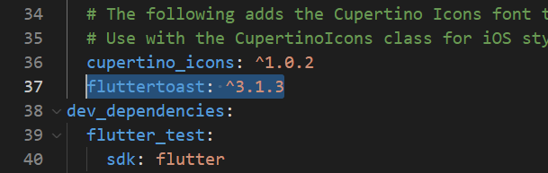 플러터 토스트 공식문서(https://pub.dev/packages/fluttertoast)를 통해 fluttertoast의 최신버전을 확인하고 버전을 높여 등록하였다.