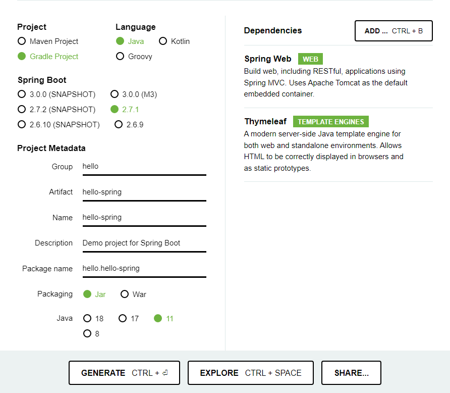 스프링 기반 프로젝트를 만들어 주는 사이트. spring에서 운영