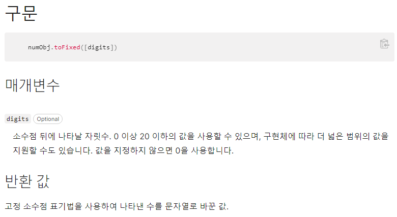 숫자를 고정 소수점 표기법(fixed-point notation)으로 표시하는 메서드, 소수점 아래 N자리까지 표현