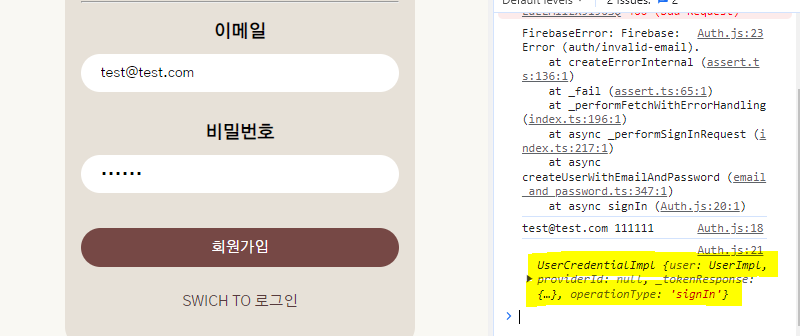 사용자에게 입력받은 아이디, 비밀번호를 이용해 유효성을 검사한 후 createUserWithEmailAndPassword 메서드에 전달하는 방식으로 회원가입 한다.