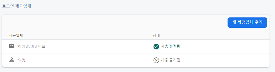 이제 메뉴 > Authentication 탭 > Sign in method에 들어가서 새 공급업체 추가를 눌러준다.