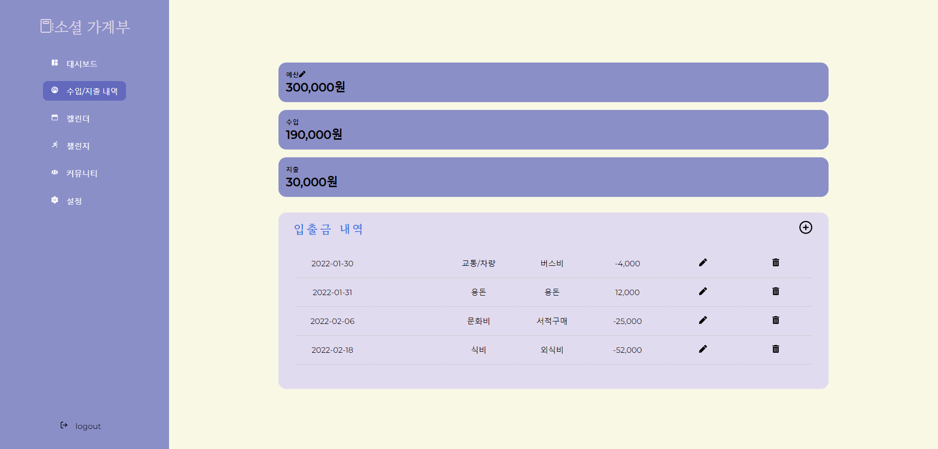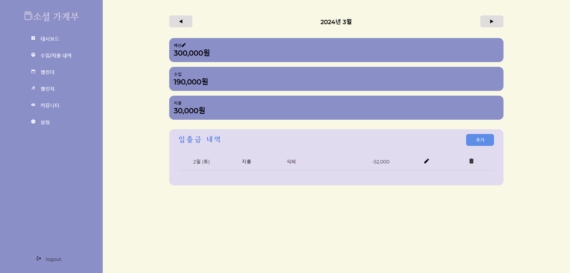 헤더 양옆의 버튼을 누르면 조회하고자 하는 month의 가계부 기록을 확인할 수 있다.