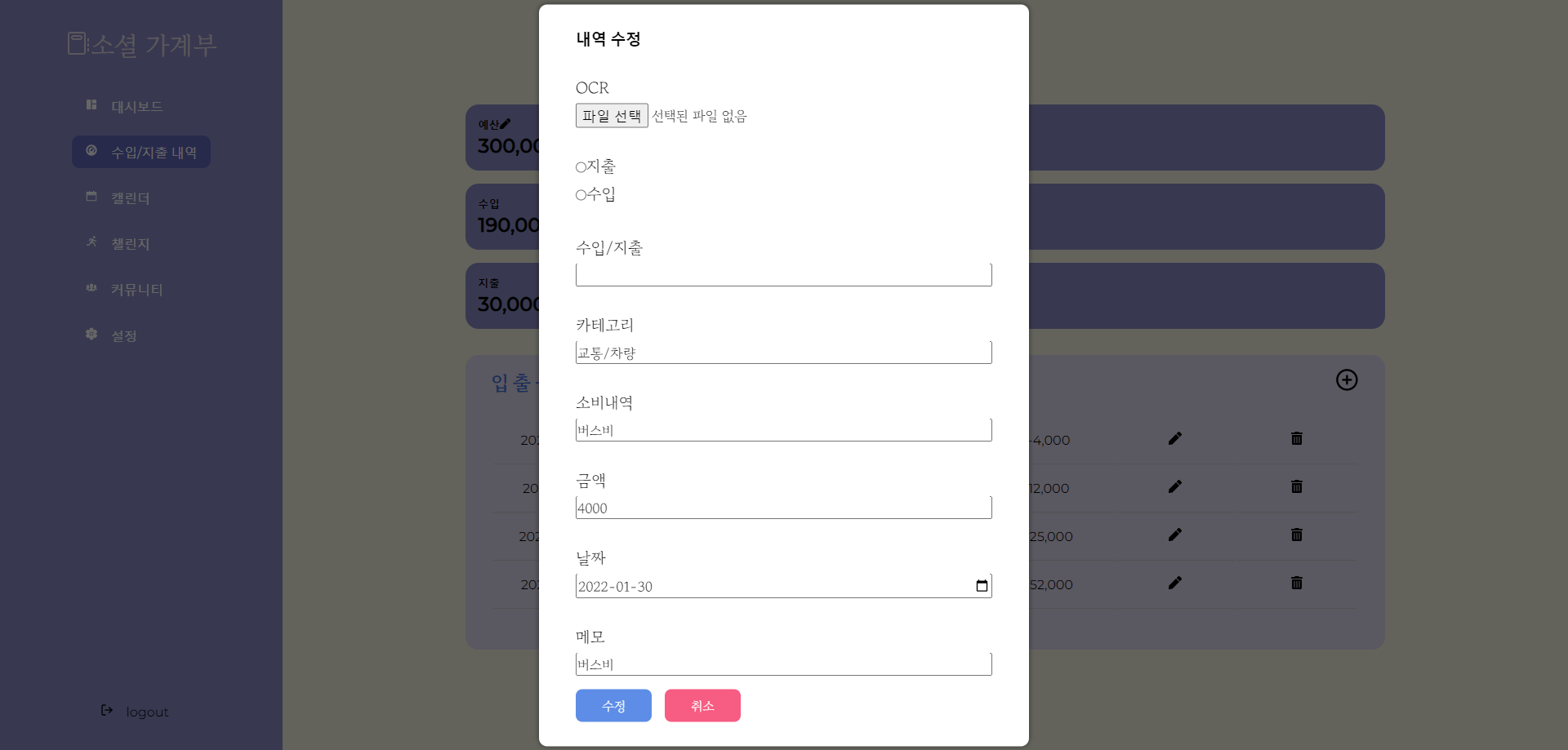 내역 수정과 조회에 필요한 내역은 모두 모달을 이용하여 하도록 구현했고 모달 내부는 UI적 요소와 필요없는 필드 제거 정도만 진행해도 될 것 같다.