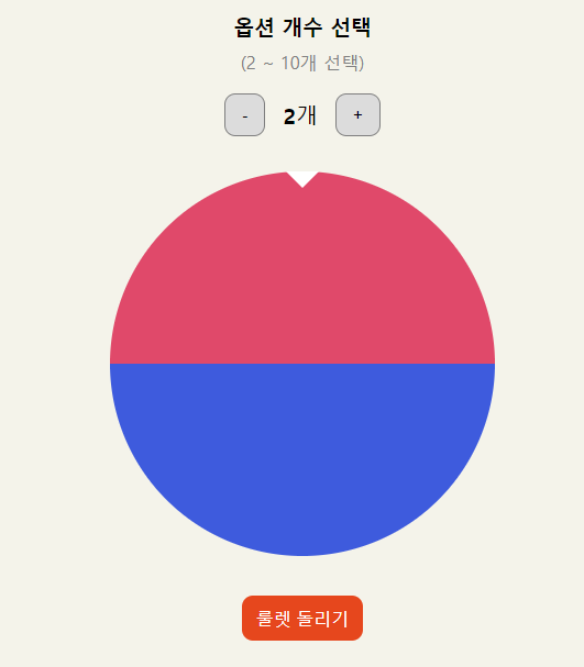 옵션 개수 선택 (2 ~ 10개 선택) 룰렛 돌리기 옵션을 모두 입력한 뒤 완료 버튼을 눌러주세요.