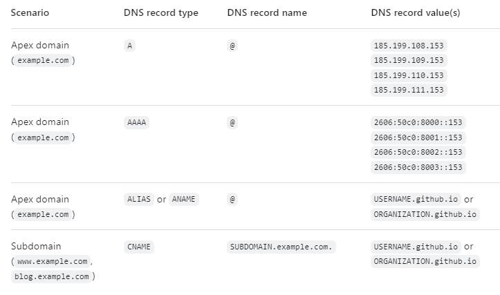 처음에는 A 타입 레코드와 주어진 ip 주소 중 하나를(페이지에 기입된 ip 중 아무거나 입력해도 된다) 입력하여 하위도메인을 등록하려 했는데, github pages 도메인 체크 과정에서 cname 사용하라는 에러가 떠서, cname 방식으로 도메인을 등록했다.