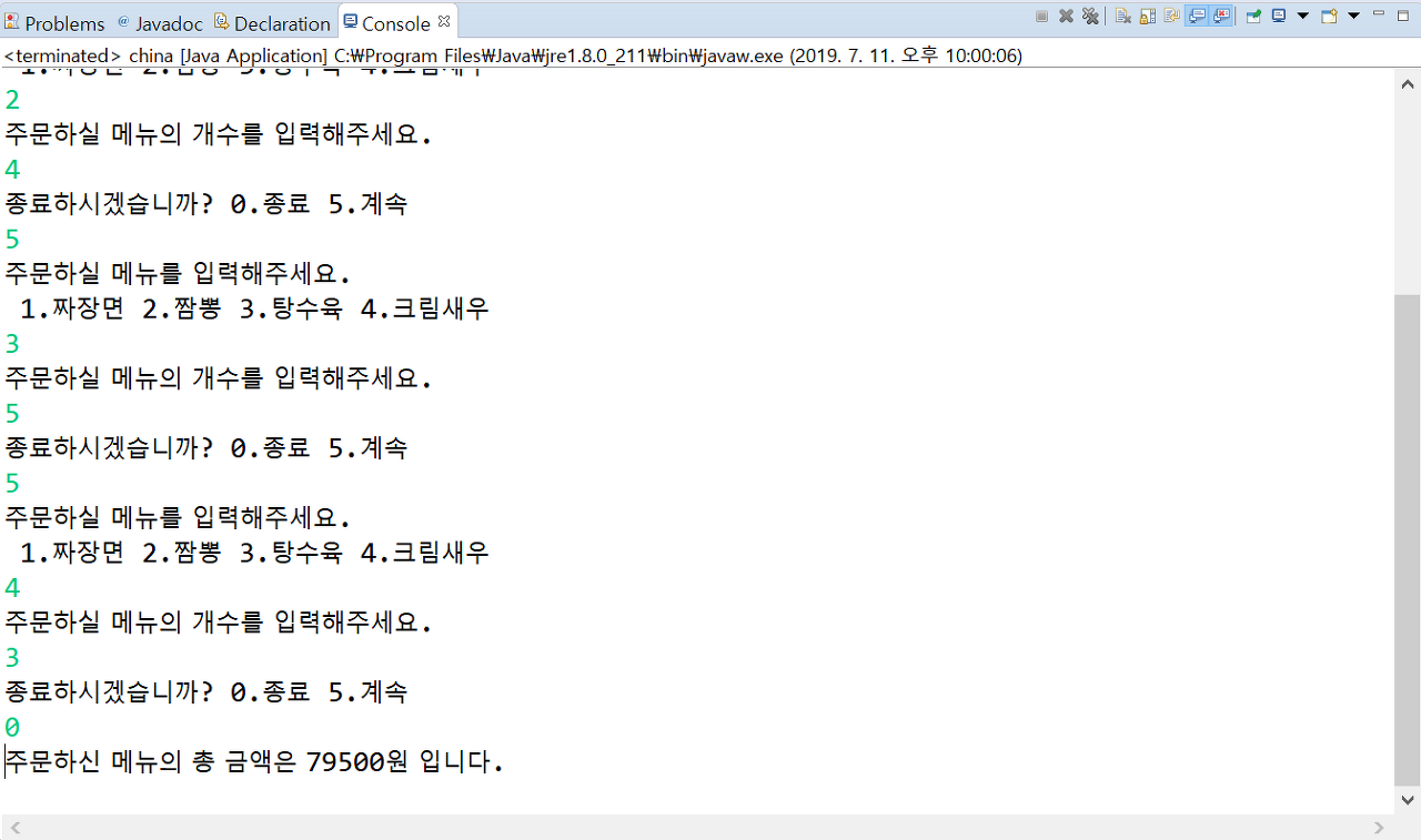 처음에 ord = Integer.parseInt(sc.nextLine()); 부분을 추가하지 않았었는데, 바로 메뉴 주문판이 떠서 의도대로 코딩이 되지 않았었다.
