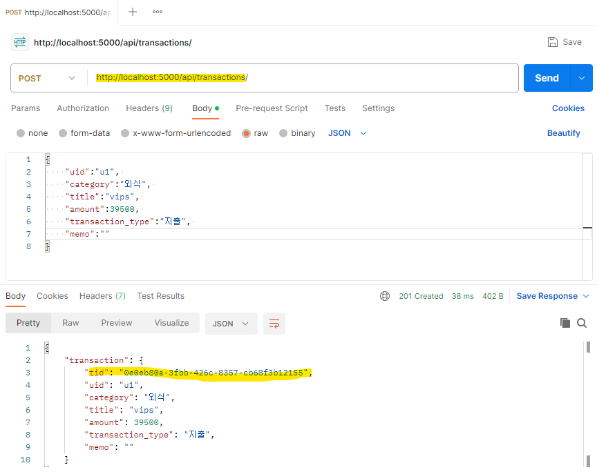 정상적으로 가계부가 게시되었는지 살펴보려면 post man을 이용해 직접 request를 날려보면 된다.
