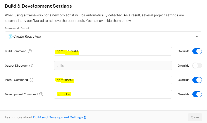 빌드 및 배포 명령어 설정을 해주는 데 있어 시행착오가 좀 있긴 했지만(기존에 yarn으로 프로젝트를 실행하던 적이 있어서 yarn 관련 코드를 완전히 정리하는 과정을 거쳤다) 배포를 완료했다. 빌드 환경설정은 나의 경우 아래와 같이 명령어를 등록해 주었더니 문제없이 배포 및 실행이 완료되었다.
