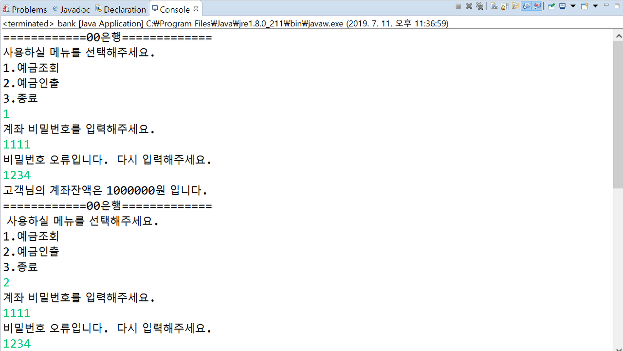 + "1.예금조회 \n2.예금인출\n3.종료");