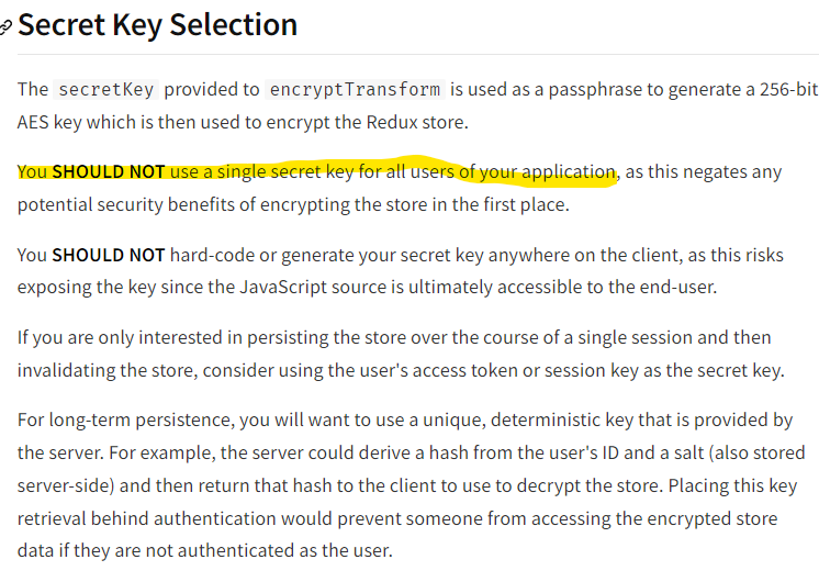 하지만 나는 `redux-persist`로 저장한 데이터를 암호화하려는 것이므로 `redux-persist`를 키워드로 잡고 보안에 대해 검색해 보았다. 그 결과 `redux-persist-transform-encrypt` 라는 라이브러리를 알게 되었다.