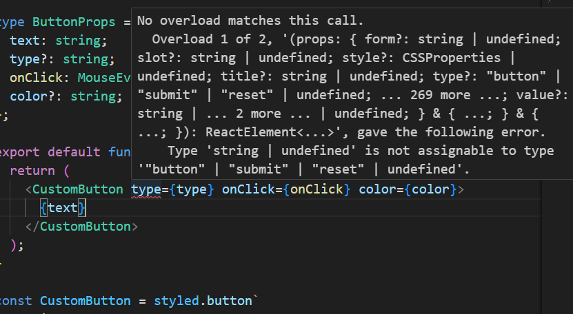 🚫 에러: 이 호출과 일치하는 오버로드가 없습니다. 2의 오버로드 1, '(프롭스: {type?: "button" | submit" | "reset" | undefined; on Click?: MouseEventHandler <HTMLButtonElement> | undefined; color?: string | undefined; ... 271 more...; onTransitionEndCapture?: TransitionEventHandler <...> | undefined; } & {...; } & {...} & {...}; }): ReactElement <...>에서 다음 오류가 발생했습니다.