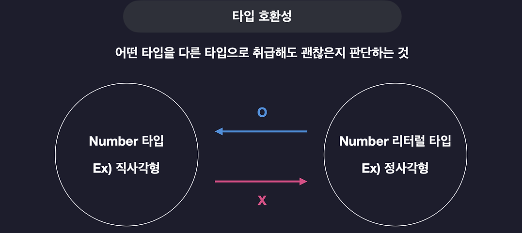 - 만약 A 타입 값이 B 타입 값으로 취급되어도 괜찮다면 호환된다라 표현하고 안 된다면 호환되지 않는다고 한다.