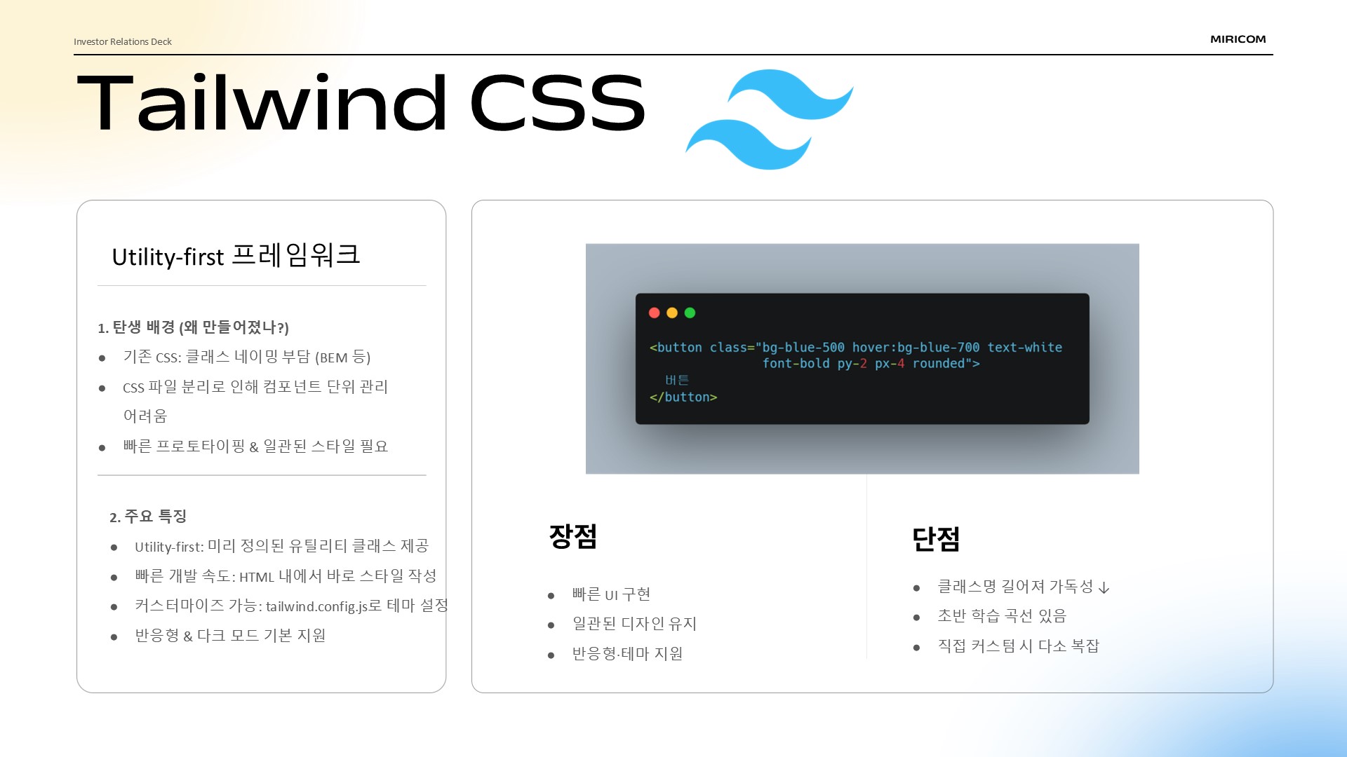 반면 클래스명이 길어져 가독성이 떨어지고, 네이밍 규칙과 조합 방식을 익히는 초반 학습 곡선이 존재한다는 점이 단점입니다.