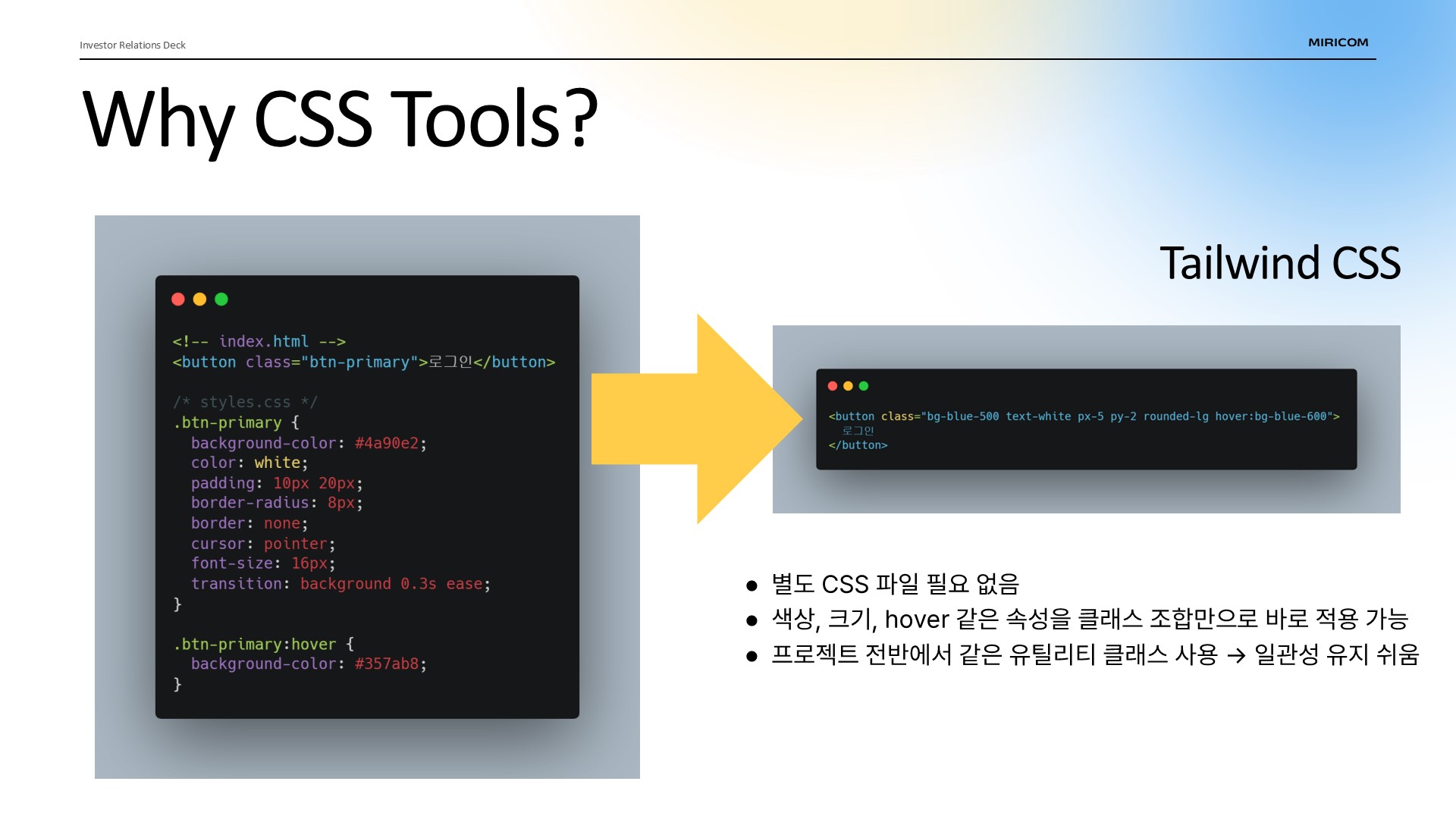 이 슬라이드를 보시면 화면에 보시는 것처럼 일반 CSS로 작성한 코드와 스타일 라이브러리 중 하나인 Tailwind를 사용한 코드사이에 차이가 확실히 보입니다. 일반 CSS를 사용할 때는 별도의 CSS 파일을 만들고 클래스와 선택자를 일일이 정의해야 해서 코드량이 많아지고 관리가 번거롭습니다. 반면 Tailwind를 사용하면 HTML 안에서 클래스만 조합해 스타일을 적용할 수 있어 코드가 훨씬 간결해집니다.