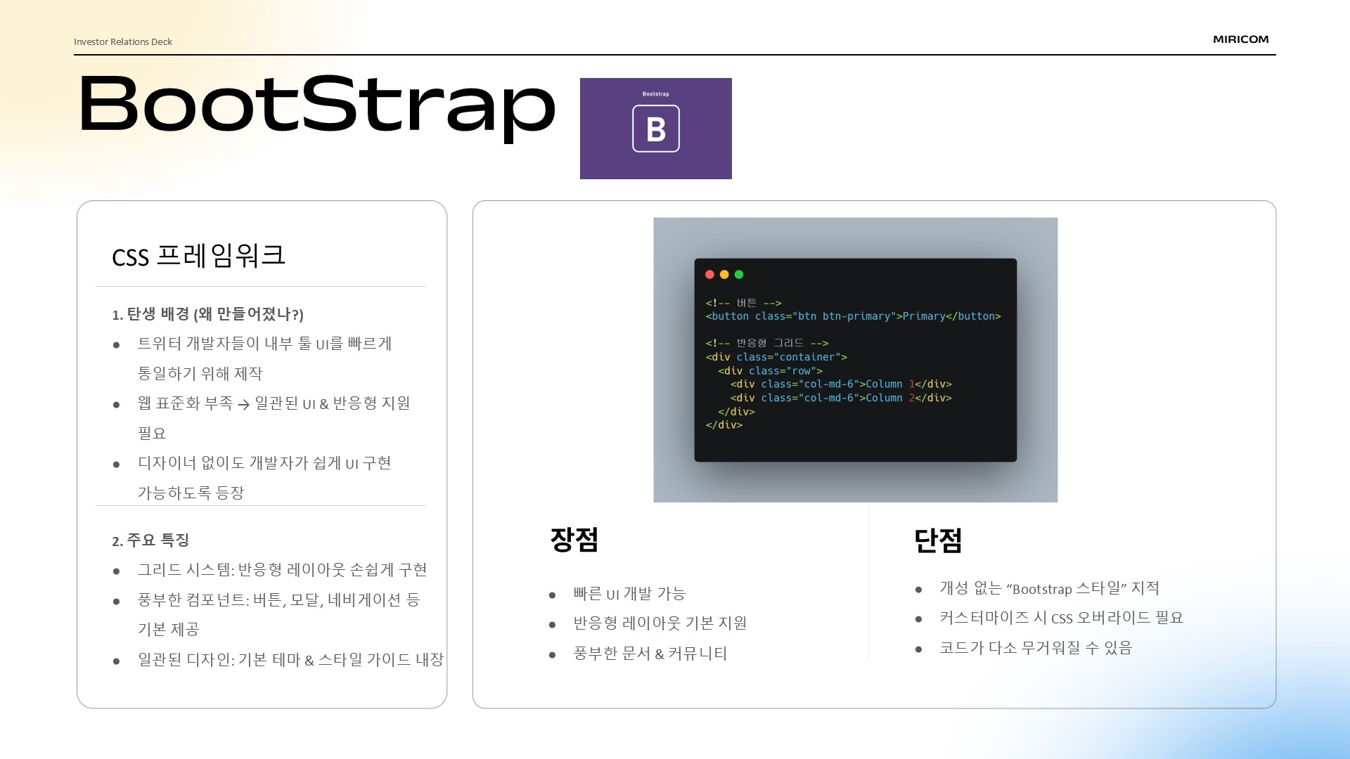 마지막으로 Bootstrap입니다. Bootstrap은 가장 널리 사용되는 CSS 프레임워크로, 트위터 개발자들이 UI 통일을 위해 제작했습니다. 풍부한 컴포넌트와 그리드 시스템을 제공해, 반응형 레이아웃을 쉽게 구현할 수 있고, 일관된 디자인과 공식 문서, 활발한 커뮤니티까지 갖추고 있다는 점이 큰 강점입니다.