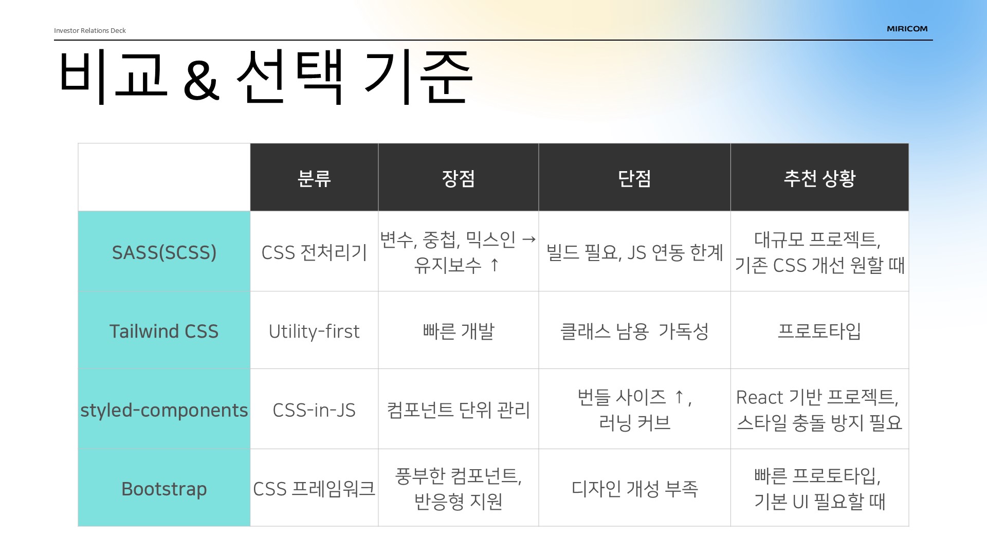 오늘은 이렇게 CSS 라이브러리의 분류, 특징, 장단점, 선택 기준까지 살펴보았습니다.
