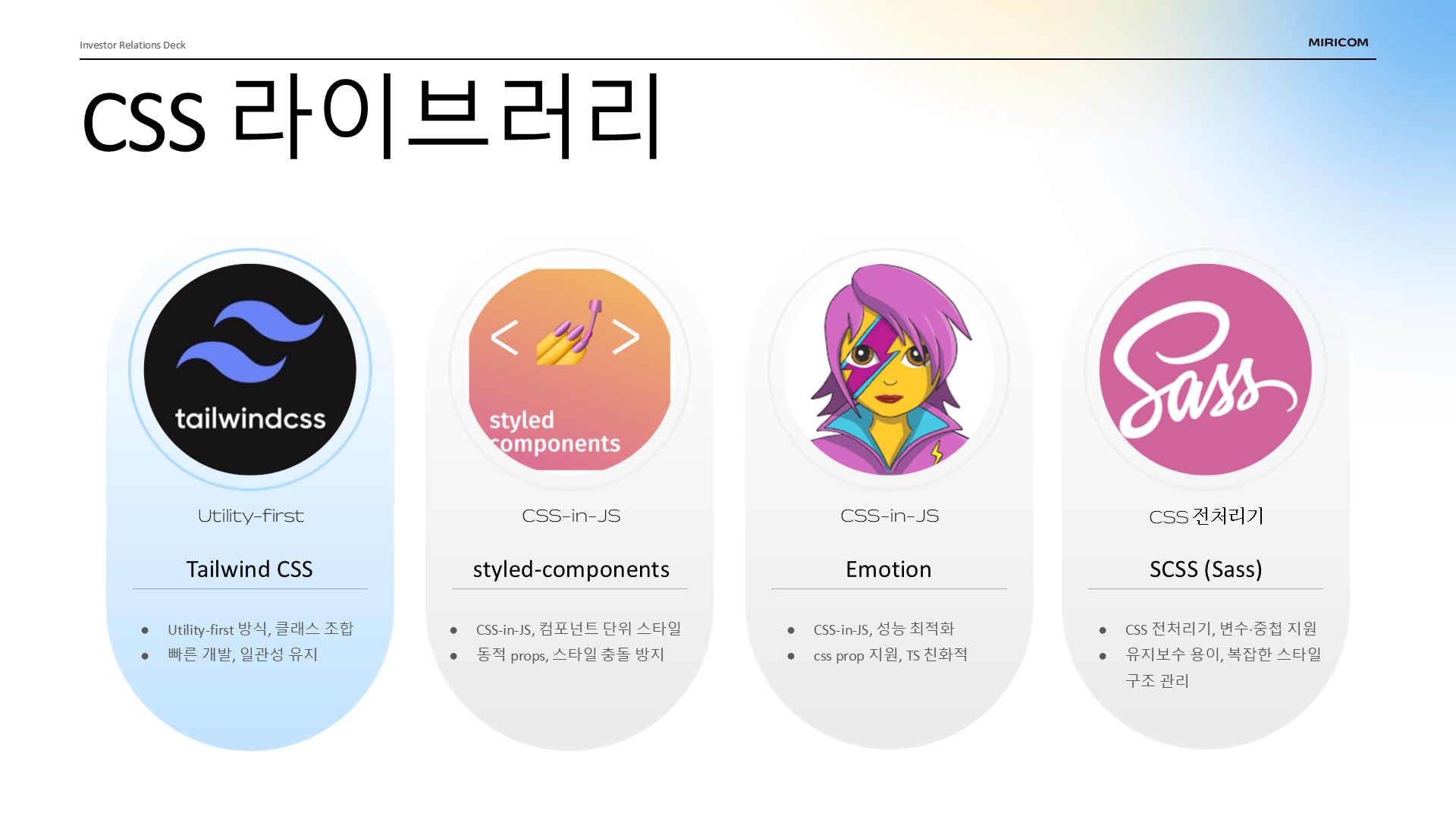 여기까지가 라이브러리의 분류를 말씀드렸고, 이제는 여러가지 css 툴 중 특정 네 가지를 골라서 조금 더 자세히 살펴보겠습니다.
